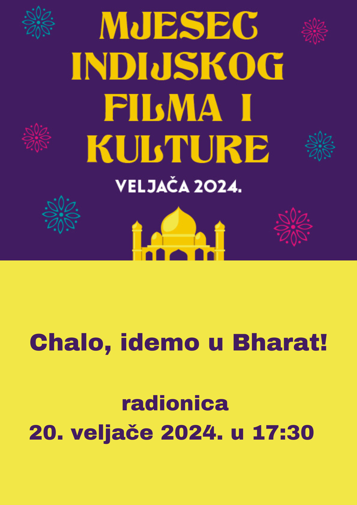 U utorak 20. veljače 2024. u 17:30 u sklopu Mjeseca indijskog filma i kulture održat će se radionica „Chalo, idemo...
